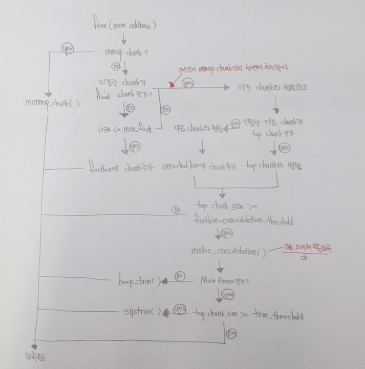 - libc_free() → mmap으로부터 할당된 메모리일 경우, munmap_chunk()함수를 통해 메모리 해제.