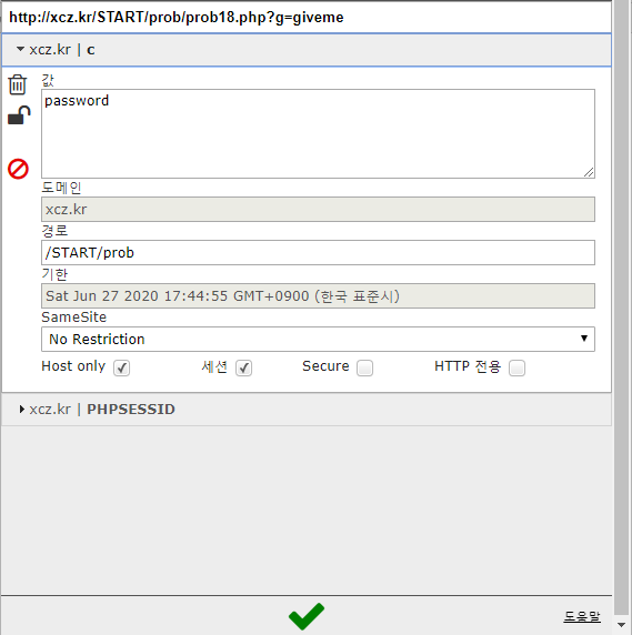 http://xcz.kr/START/prob/prob18.php 의 Cookie에 'c':'password' 넣기 !