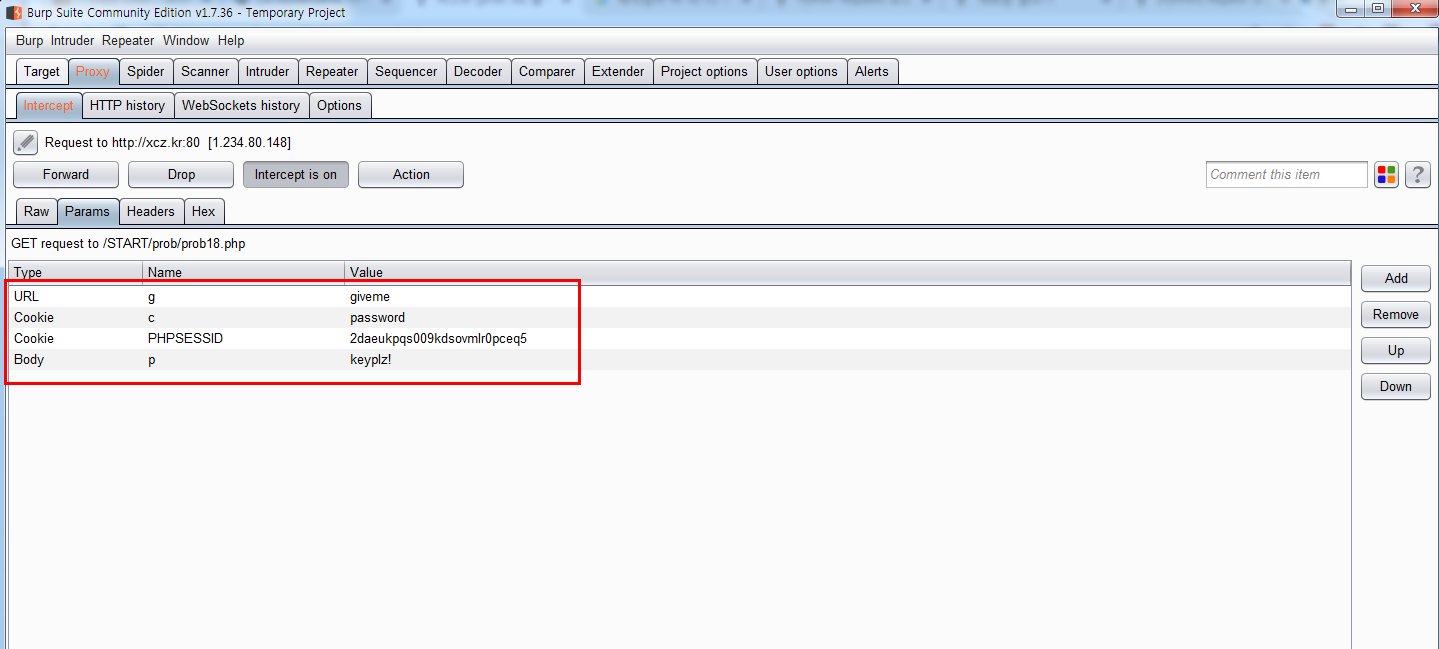 http://xcz.kr/START/prob/prob18.php 의 GET 파라미터로 'g'='giveme' 넘겨주기 !