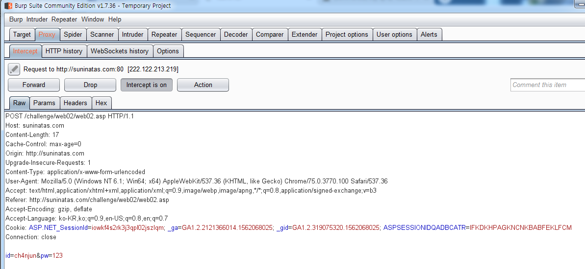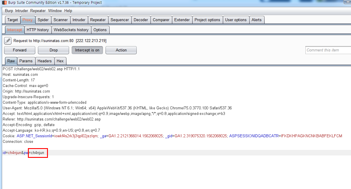 그리고 Submit되는 Request패킷을 캡쳐해서 Data를 수정해서 ID와 PW를 같은 값으로 넘겨준다.