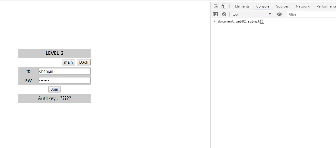 때문에 Browser의 Console창에서 직접 document.web02.submit()을 입력해 바로 Submit해주었다.