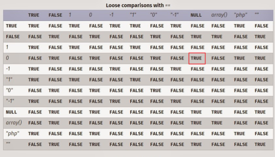 NULL과 0을 비교하게되면 Loose Comparisons에서 TRUE를 반환하게된다.