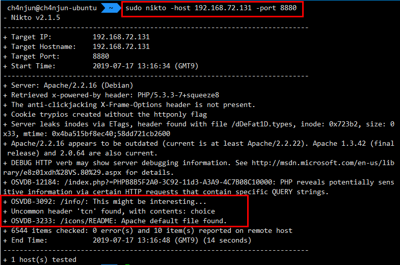 웹서버에 접속해보기 전에 마지막으로 nikto 를 통해 취약점 스캔을 진행하겠다.