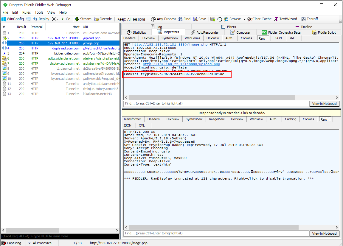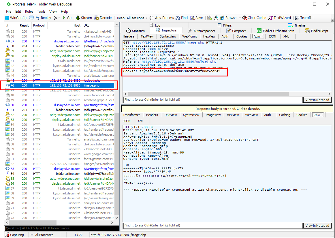 특이한점은 업로드될때 image.php가 호출되는데 이 때 쿠키를 통해 파일명이 노출된다는 점이다.