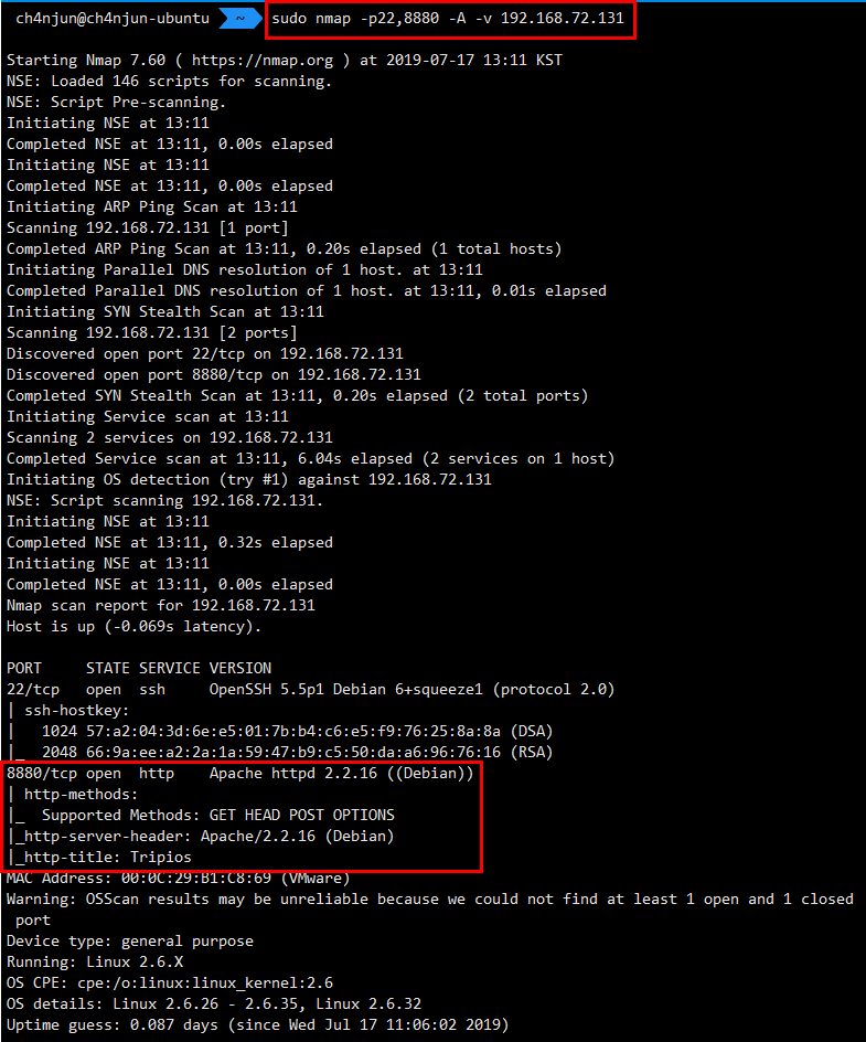 자세히 조회해본 결과 8880 포트에서 사용하는 SERVICE는 http이고 Apache httpd 2.2.16 (Debian) Version을 사용하는 것으로 확인되었다. 한마디로 웹서버가 사용하는 포트라는 말이다.