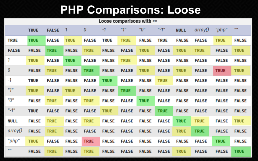 이 표를 보면 PHP에서 == 으로 비교를 했을 때 "php" 문자열과 TRUE 불린값을 비교하면 TRUE가 나온다.