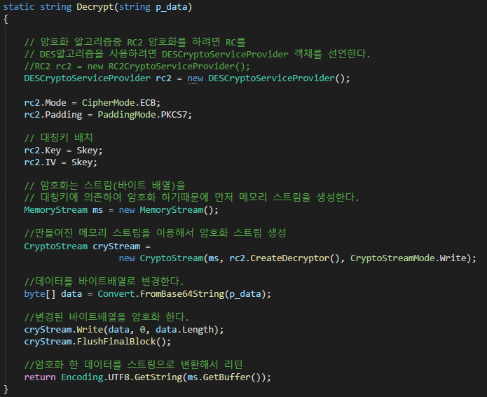 // DES알고리즘을 사용하려면 DESCryptoServiceProvider 객체를 선언한다.