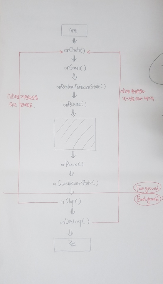 추가로 onRestart가 있는데 onStop 상태에서 onStart로 가는 중간과정이 되겠다.