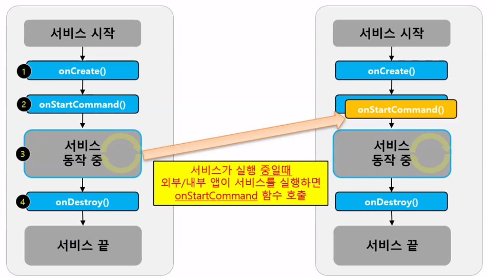 이미 Service가 실행중일 때 startService가 다시한번 호출될 경우 onCreate는 생략되고 onStartCommnad 생명주기 함수가 한번 더 호출되게 된다.