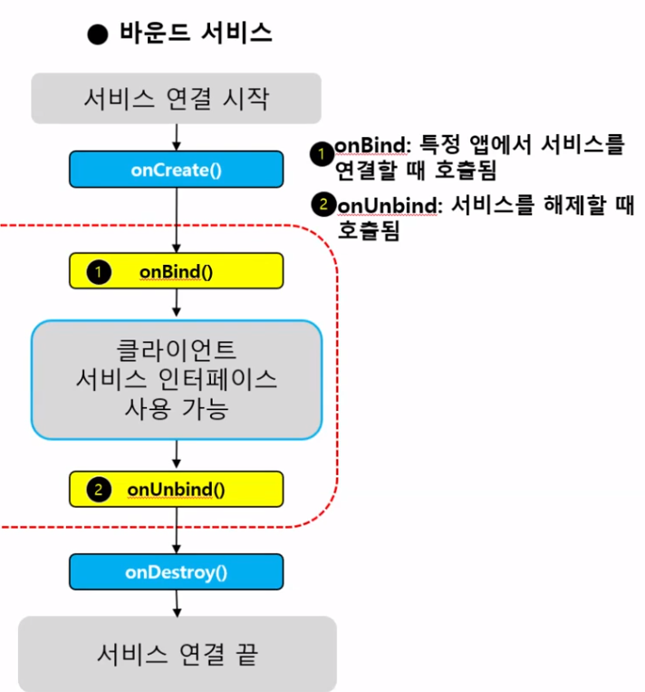 기존에 Stared Service에서는 서비스의 시작이라는 표현을 사용했지만 Bound Service는 라이브러리와 같은 동작방식을 갖기 때문에 서비스 연결 시작(Import의 개념..?) 이라는 표현을 사용한다.